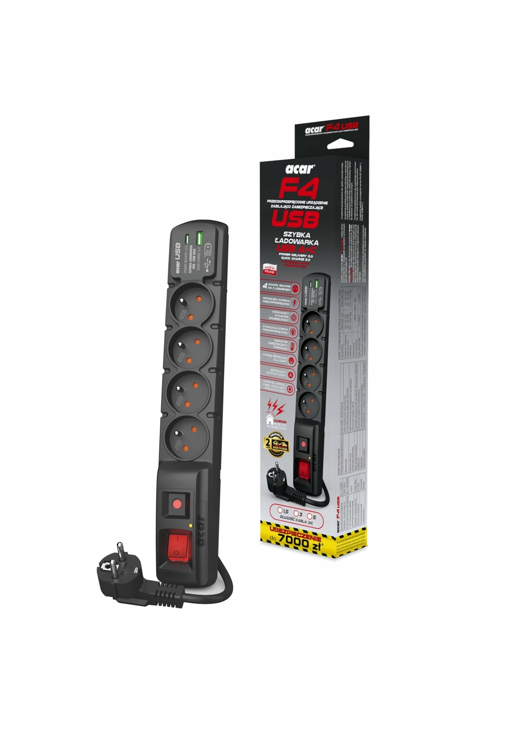 acar F4 USB A+C to nowoczesna listwa przeciwprzepięciowa zabezpieczająca cztery urządzenia jednocześnie. Zintegrowana z urządzeniem szybka ładowarka o łącznej mocy 18W, obsługuje protokoły ładowania Quick Charge 3.0 (gniazdo USB-A) oraz Power Delivery 3.0 (gniazdo USB-C). Trzeba zaznaczyć, że acar F4 USB A+C podobnie jak wszystkie listwy marki acar został wykonany z najwyższą starannością oraz zgodnością z obowiązującymi normami. Szybka ładowarka USB spełnia wymagania kompatybilności elektromagnetycznej, czyli nie zakłóca pracy innych urządzeń. Sygnalizacja układu protekcji dodatkowo zwiększa pewność, że listwa skutecznie chroni przed przepięciami podłączone do niej odbiorniki. Podświetlenie portów USB ułatwia sprawne podłączenie urządzeń do odpowiedniego gniazda nawet w ciemności. Cztery gniazda sieciowe z uziemieniem, zwarta konstrukcja oraz wzbogacona funkcjonalność pozwalają na wszechstronne zastosowanie listwy acar F4 USB A+C w domu i w biurze.