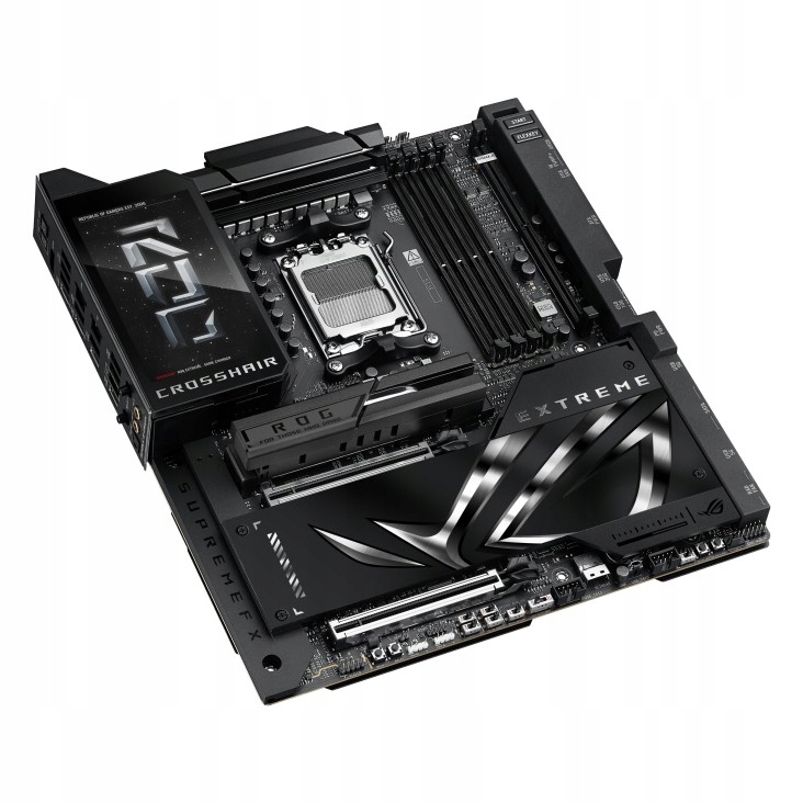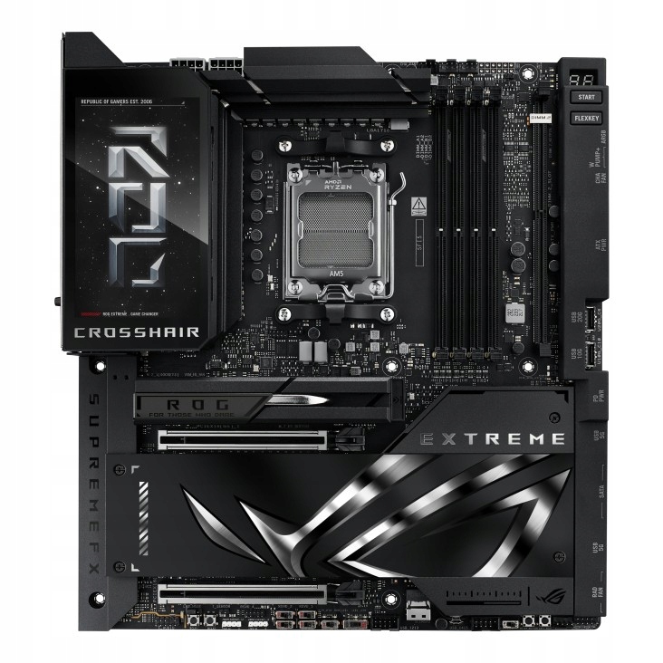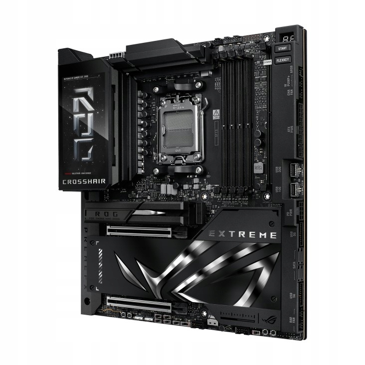 ROG Crosshair X870E Extreme to flagowa płyta główna dla procesorów AMD Ryzen serii 9000, zaprojektowana z myślą o najbardziej wymagających użytkownikach. Zapewnia najwyższą jakość podstawy dla procesorów AM5, pamięci DDR5 i komponentów PCIe 5.0, gwarantując maksymalną wydajność i gotowość na przyszłość. Bogate możliwości łączności obejmują USB4, a zintegrowany 5-calowy wyświetlacz LCD oferuje unikalny sposób monitorowania wydajności systemu lub dodania spersonalizowanego stylu.