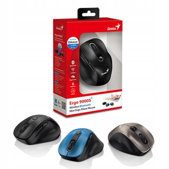 Genius Ergo 9000S Mini to bezprzewodowa mysz o ergonomicznym kształcie, zapewniająca wygodę i komfort użytkowania przez długie godziny. Dzięki zastosowaniu optycznego sensora z możliwością regulacji rozdzielczości nawet do 2400 DPI, zapewnia precyzyjne śledzenie ruchów na ekranie. Połączenie z komputerem odbywa się bezprzewodowo poprzez Bluetooth lub odbiornika USB 2,4 GHz. Co więcej, mysz może być jednocześnie podłączona do aż trzech urządzeń, a użytkownik może łatwo przełączać się między nimi za pomocą jednego przycisku (tryb Dual BT + 2,4 GHz).