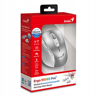 Genius Ergo 9000S Pro oferuje niezrównane opcje łączności, umożliwiając połączenie z komputerem za pomocą technologii Bluetooth lub małego odbiornika USB działającego w paśmie 2,4 GHz. Co więcej, mysz może być podłączona do aż trzech urządzeń jednocześnie, dzięki czemu łatwo można przełączać się między nimi za pomocą jednego przycisku (tryb Dual BT + 2,4 GHz). Dodatkowo, dzięki możliwości przechowywania miniatury odbiornika USB w korpusie myszy, zapewnia się wygodę i mobilność użytkowania.