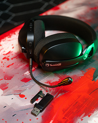 Słuchawki Marvo HG9086W Black wyposażone są w dookólny mikrofon, który gwarantuje doskonałą jakość transmisji komunikatów. Dzięki możliwości wyboru pomiędzy połączeniem przewodowym a bezprzewodowym, użytkownik może dostosować sposób komunikacji do swoich preferencji lub poziomu naładowania akumulatora. Zarówno połączenie Bluetooth 5.0, jak i 2,4 GHz zapewniają stabilne połączenie z szerokim spektrum urządzeń, w tym komputerami oraz konsolami PS4 i PS5.