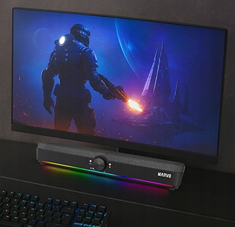 Stylowy soundbar marki Marva SG-286 świetny do oglądania filmów, grania w gry i słuchania muzyki? Ponadto ten stylowy wygląd naprawdę pasuje do każdego telewizora lub monitora. Jeśli jesteś zapalonym graczem, uzupełnij swoją ofertę o soundbar Marvo i przygotuj się na poważne bitwy. W momencie potrzeby zmiany poziomu dźwięku, pokrętło regulacji głośności znajduje się na środku soundbara i jest od razu pod ręką. Podświetlenie RAINBOW jest miękkie, ale jednocześnie wystarczająco skuteczne, więc nie musisz się martwić, że będzie przeszkadzać podczas gry. Soundbar podłącza się przez USB lub można nim sterować również poprzez Bluetooth, który ma zasięg aż do 10 metrów.