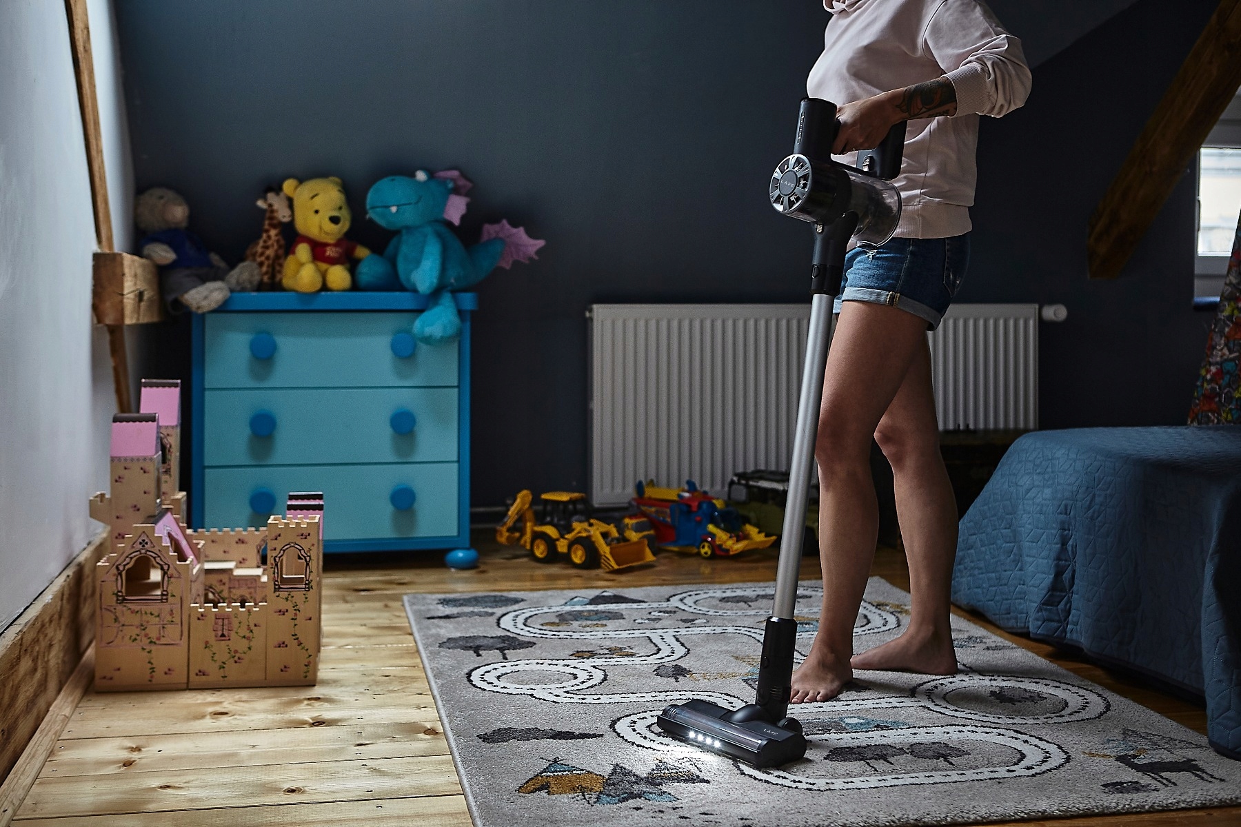 Zintegrowane podświetlenie LED na głowicy odkurzacza precyzyjnie oświetla podłogę, sprawiając, że nawet najmniejszy kurz, zwykle niewidoczny na twardych powierzchniach, staje się widoczny.