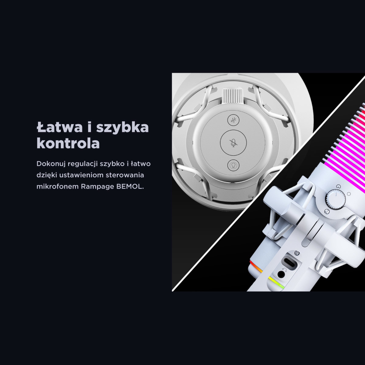 Mikrofon Rampage BEMOL wyposażony jest w efektowne podświetlenie RGB, które pozwala na dostosowanie wyglądu do Twojego nastroju i stylu pracy. Twórz w wyjątkowej atmosferze i przyciągaj uwagę estetyką swojego stanowiska.