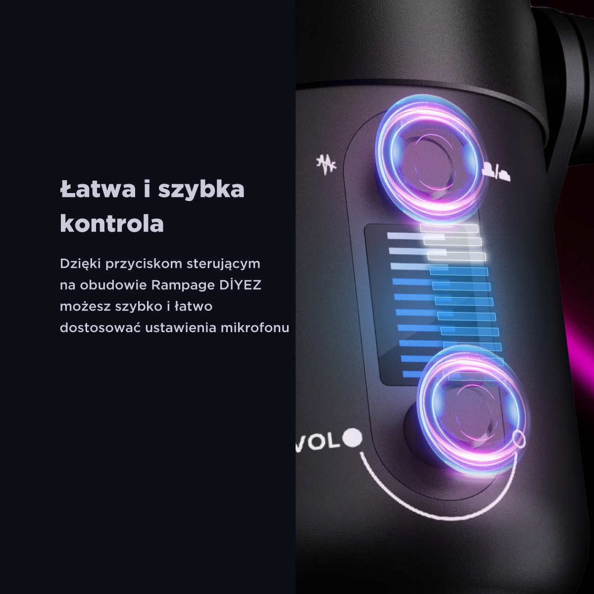 Rampage Diyez to mikrofon dla tych, którzy cenią sobie pełną kontrolę nad dźwiękiem. Wyposażony w podświetlenie RGB, dotykowe sterowanie i intuicyjne przyciski, pozwala szybko regulować głośność, wyciszać i dostosowywać efekty świetlne. Elegancki czarny design sprawia, że idealnie komponuje się na każdym stanowisku.