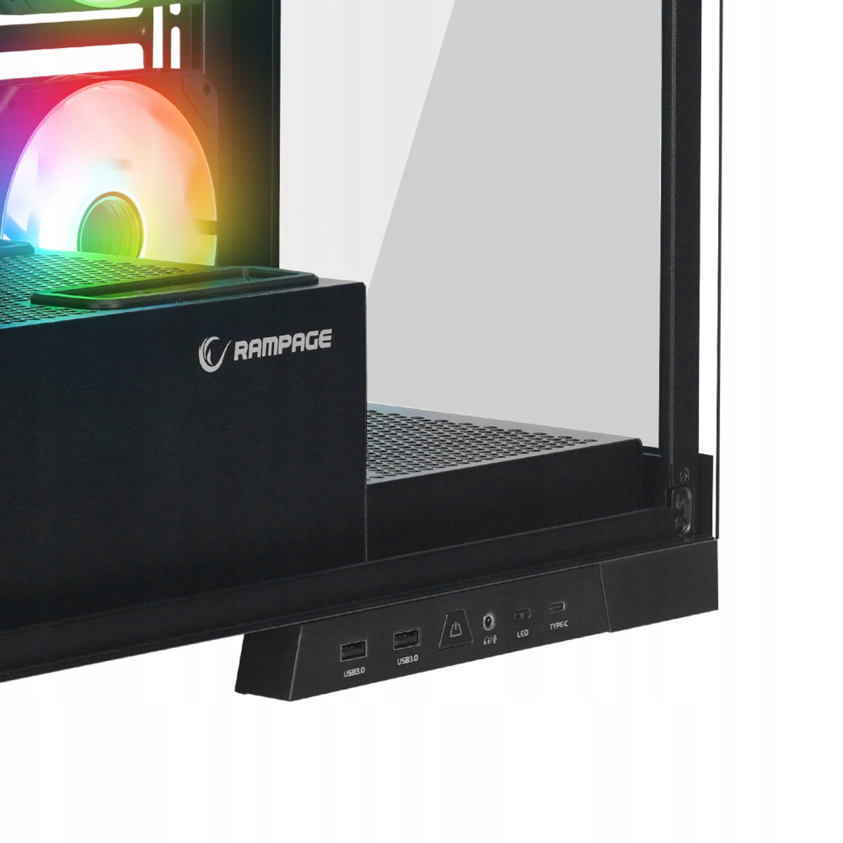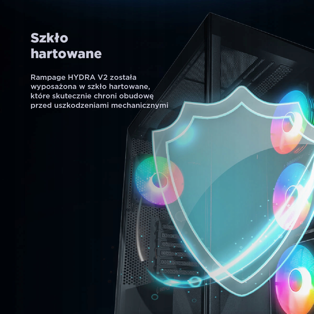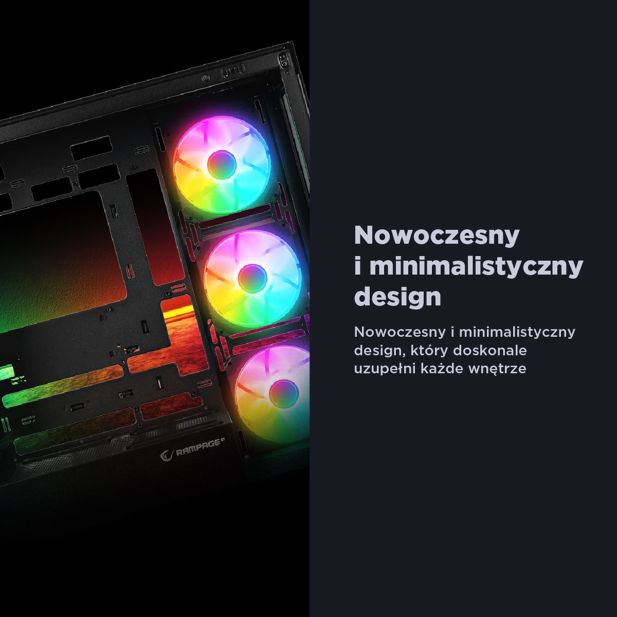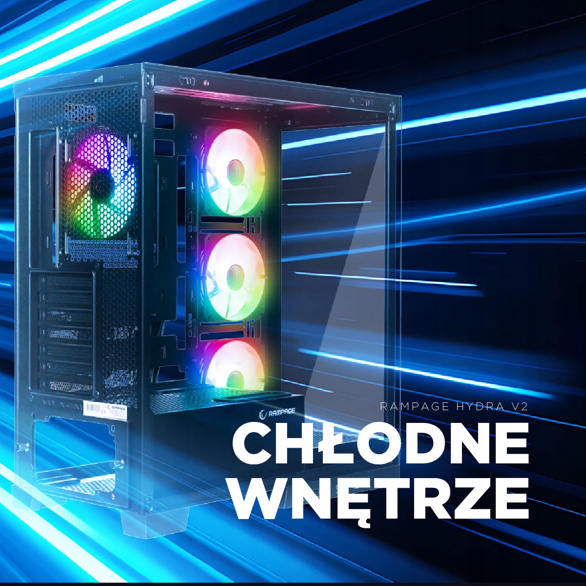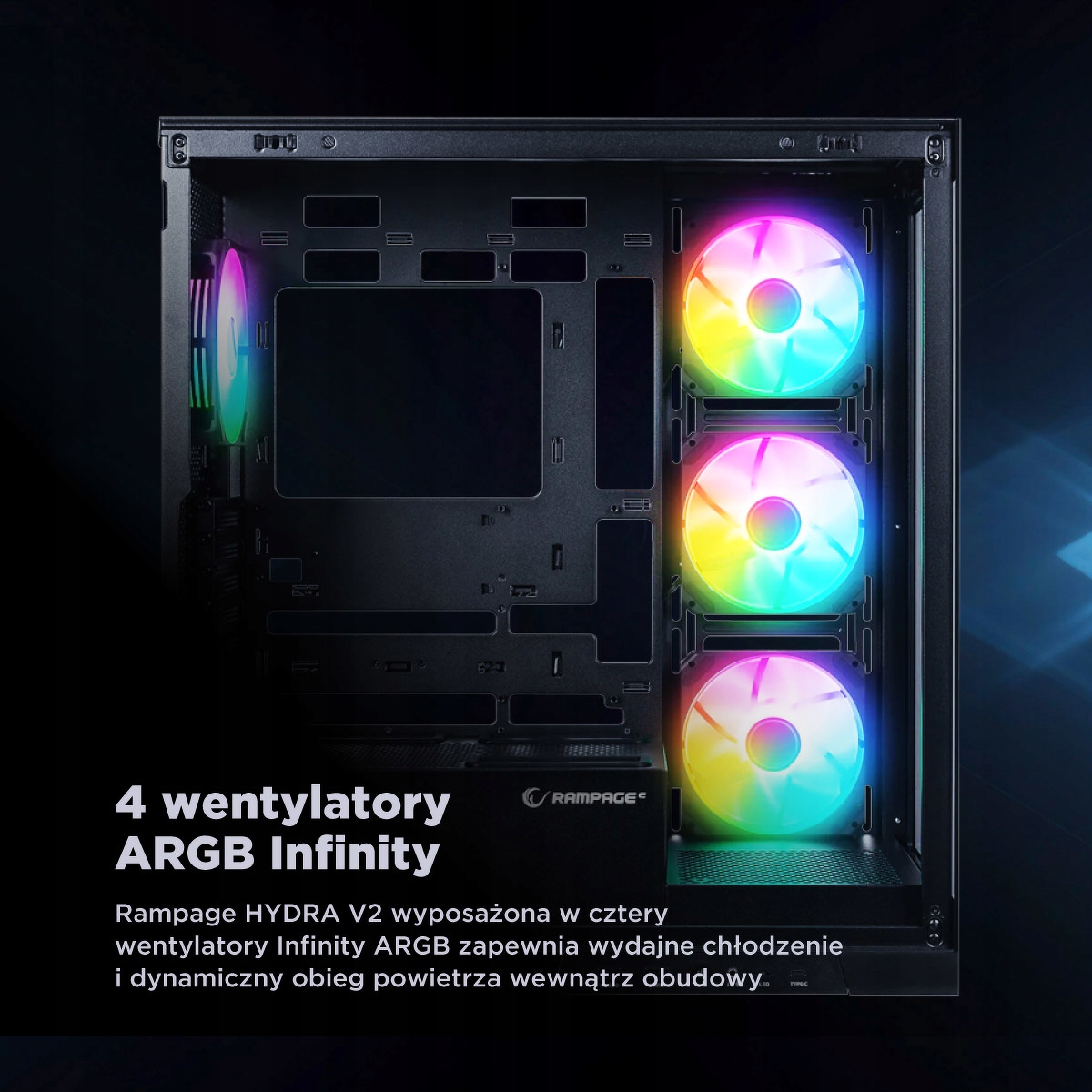 Rampage Hydra V2 Black to coś więcej niż obudowa – to scena dla Twoich komponentów. Dzięki panoramicznym panelom z hartowanego szkła, czterem wentylatorom ARGB z efektem infinity oraz wbudowanemu kontrolerowi podświetlenia, każdy zestaw w środku wygląda jak sprzęt z gamingowego showroomu. To rozwiązanie dla entuzjastów, którzy cenią styl, przestrzeń i efekt „wow”.