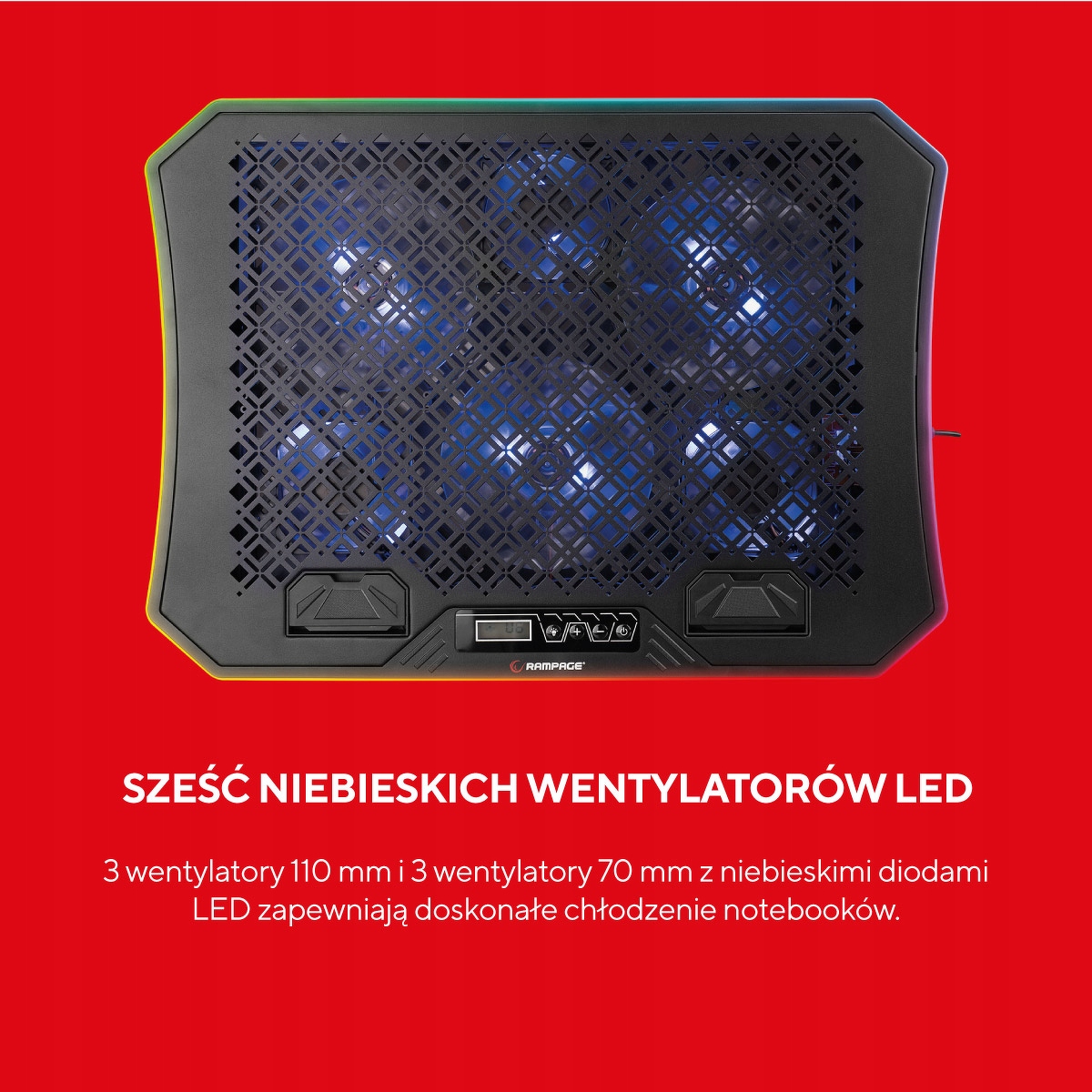 Rampage METAFOR to solidnie wykonana podstawka, z metalu i tworzywa. Dzięki zastosowanym materiałom użyjesz jej bezpiecznie nawet z dużymi urządzeniami. Podstawka chłodząca obsługuje laptopy o tak małej przekątnej jak 10 cali i o tak dużej przekątnej jak 19 cali! Prędkość dużych wentylatorów to 1000-1300RPM, a małych aż 1800-2100 RPM.