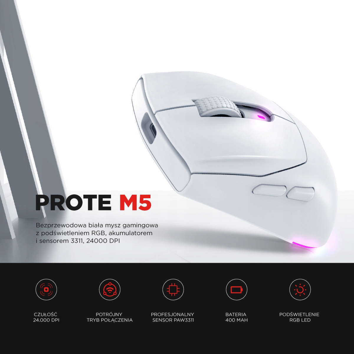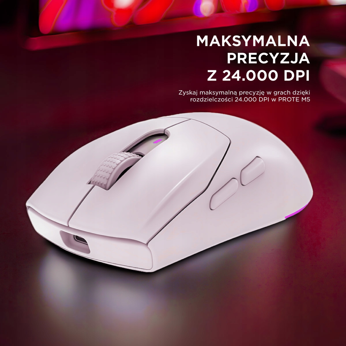 Biała Prote M5 waży niewiele, co przekłada się na większą swobodę i mniejsze zmęczenie dłoni. To szczególnie ważne podczas wielogodzinnych sesji, gdzie komfort ma bezpośredni wpływ na Twoją skuteczność. Mysz porusza się płynnie i intuicyjnie – dokładnie tak, jak tego potrzebujesz.