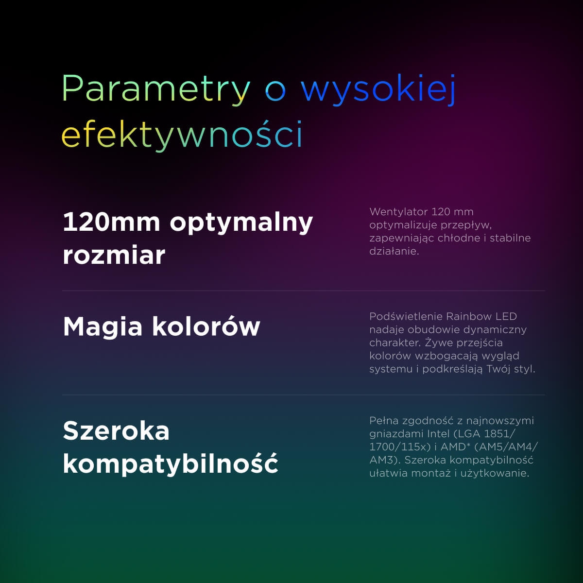 Intel czy AMD? Nieważne. Rampage RM-C04 Coolblade Rainbow wspiera najnowsze sockety Intel LGA 1851 / 1700 oraz AMD AM5. To daje Ci pełną swobodę wyboru platformy – bez konieczności wymiany chłodzenia przy przyszłych modernizacjach.