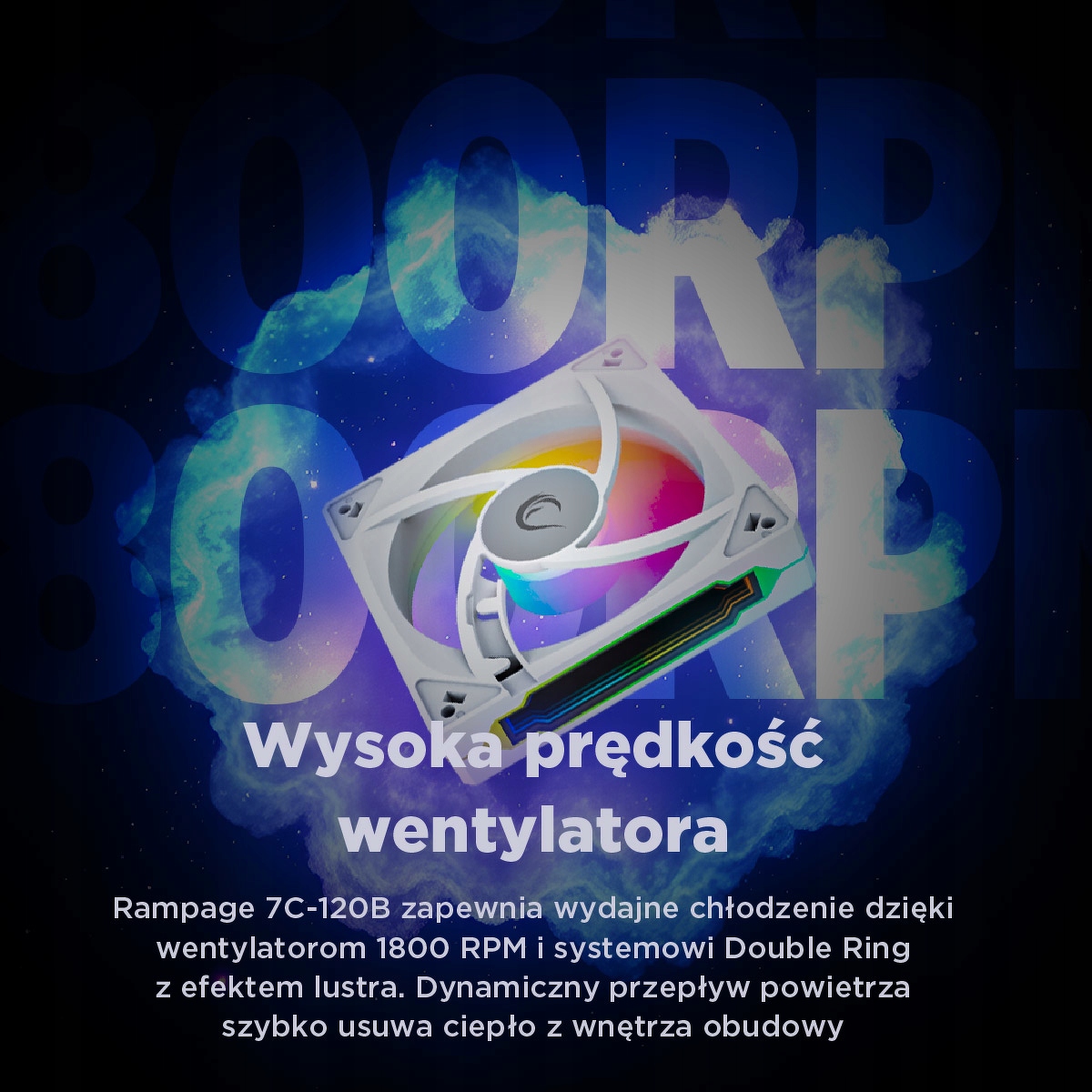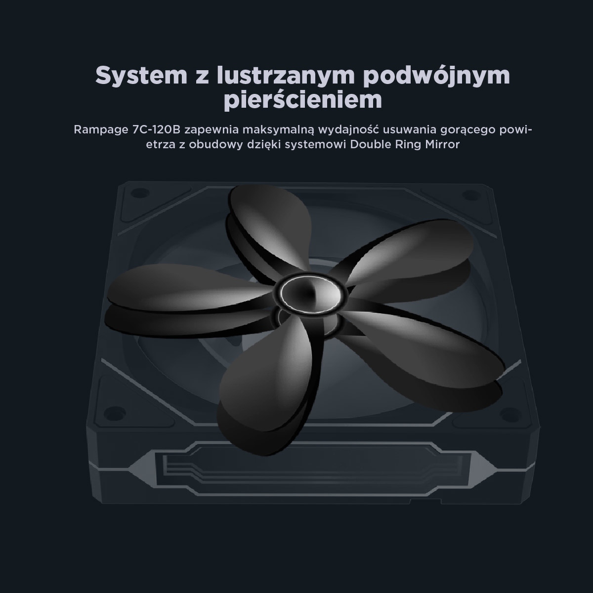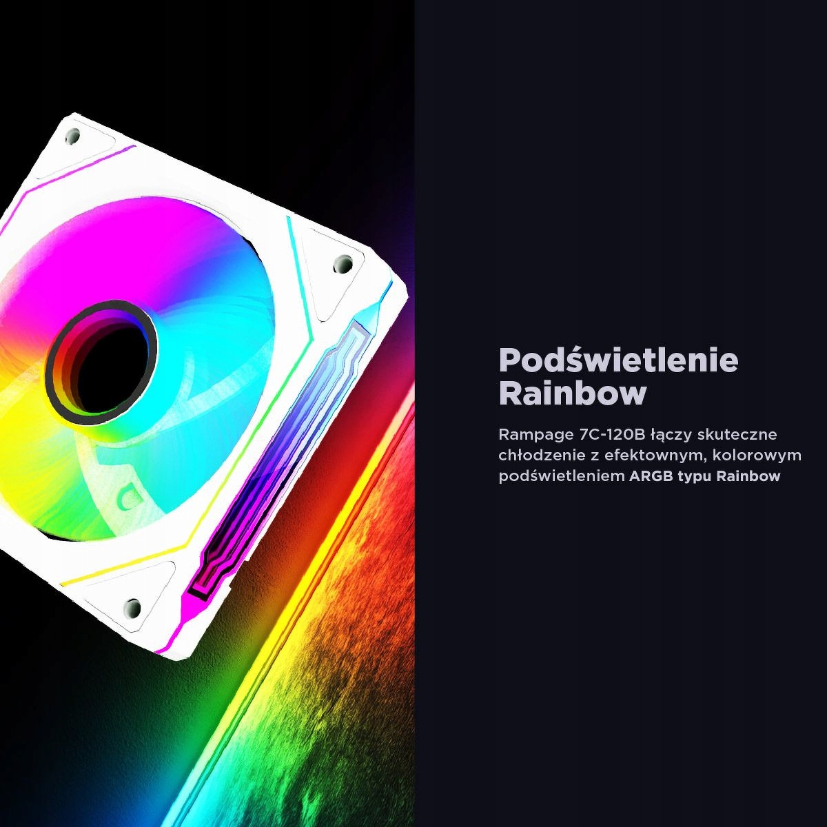 Rampage 7C-120B to wentylator obudowy o wymiarach 120 × 120 × 25 mm, który łączy wydajne chłodzenie z efektownym podświetleniem ARGB. Dzięki lustrzanemu wykończeniu z efektem infinity mirror w centrum i podwójnym pierścieniom świetlnym, przyciąga uwagę w każdej konfiguracji. Zaprojektowany z myślą o białych i jasnych zestawach komputerowych, stanowi nie tylko element funkcjonalny, ale też wyraźny akcent estetyczny.