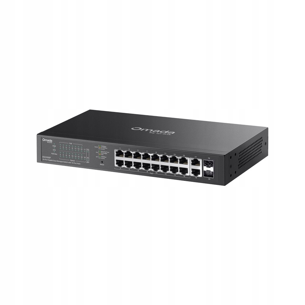 Porty:• 18 portów RJ45 10/100/1000 Mb/s (16 z obsługą PoE/PoE+)• 2 gigabitowe sloty SFP• Automatyczna negocjacja/MDI/MDIX