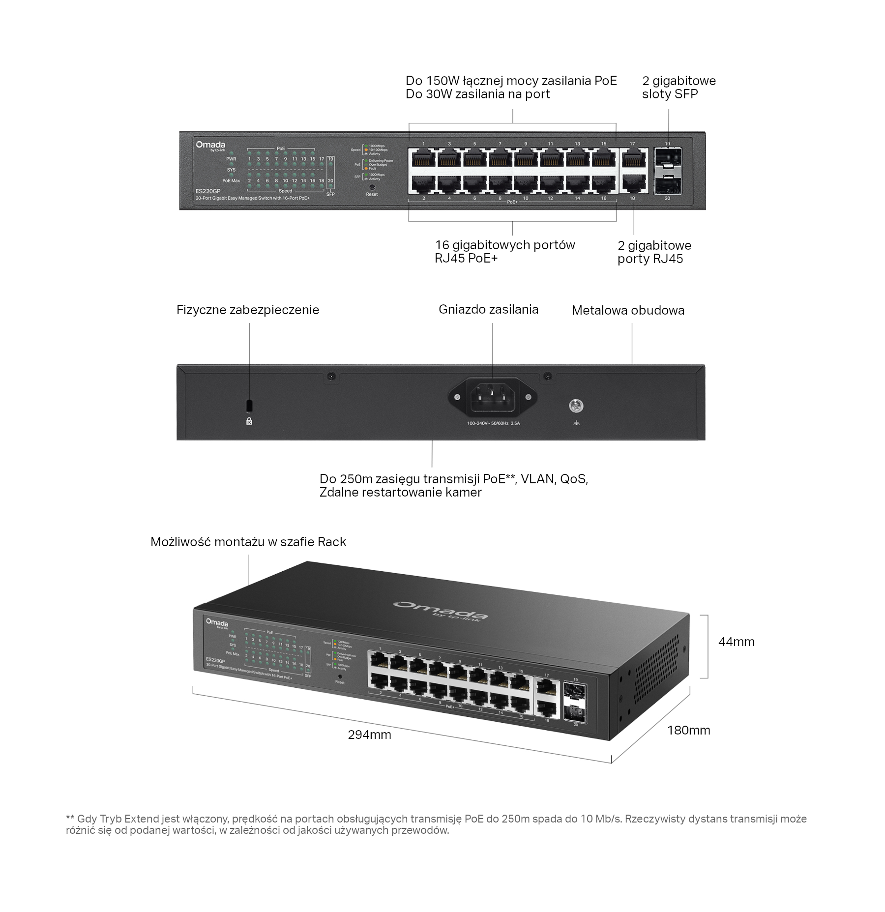 Porty PoE:• 16 portów PoE, Budżet PoE: 150W, do 30W na port• Fast PoE, PoE Auto Recovery, Do 250m zasięgu