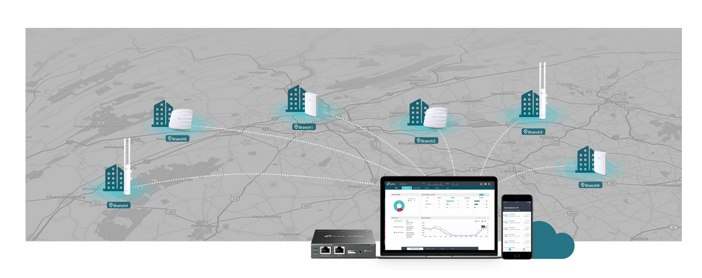 Narzędzia stworzone z myślą o przełącznikach EAP — kontroler sprzętowy Omada OC200 oraz oprogramowanie Omada Controller — to duże ułatwienie w zarządzaniu i monitorowaniu sieci Omada w czasie rzeczywistym. Natomiast dzięki usłudze cloud bezpieczny dostęp do platformy zarządzania można uzyskać z dowolnego miejsca.