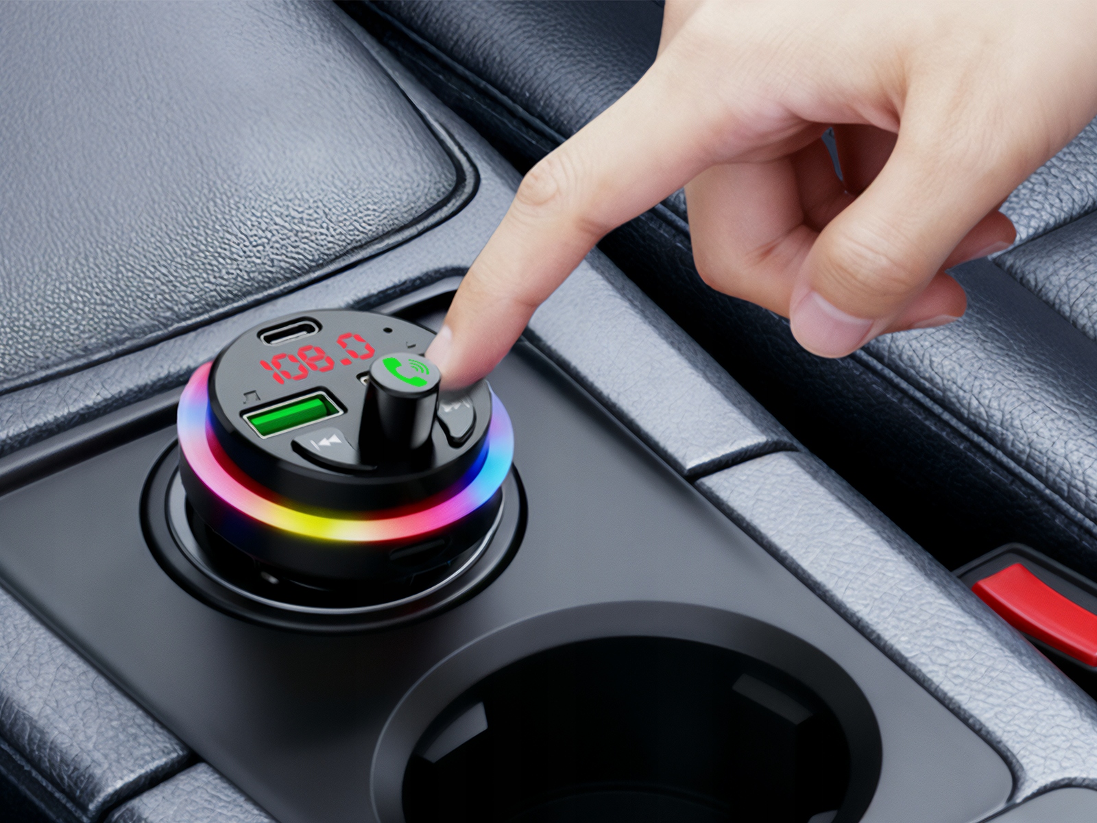 Na obudowie transmitera znajdziesz praktyczne przyciski sterujące – pozwalają na odtwarzanie/pauzę, zmianę utworów (poprzedni/następny) oraz regulację głośności przez przytrzymanie. Dwukrotne naciśnięcie przycisku wyświetla aktualne napięcie akumulatora. Wszystko masz pod ręką, bez sięgania po telefon