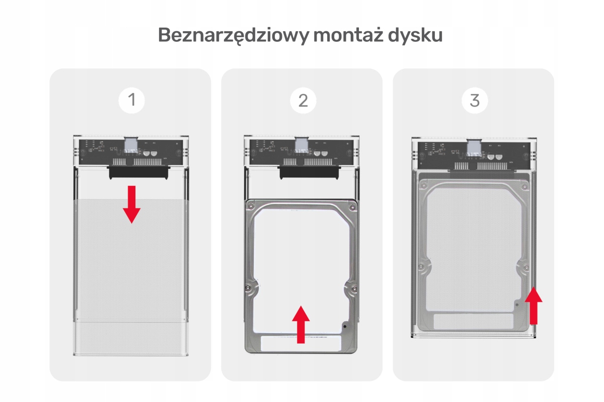 Obudowa jest zaprojektowana tak, że nie potrzebujesz żadnych narzędzi do wymienienia zamontowanego dysku. Dzięki szybkiemu podłączeniu możesz w przyszłości zmienić dysk na nowy model bez kupowania nowego adaptera. Zasilana bezpośrednio z portu USB, nie wymaga noszenia ze sobą niewygodnych zasilaczy sieciowych. Ponadto mostek jest wyposażony w technologię Plug&play, więc urządzenie nie potrzebuje instalowania sterowników. Ten model obudowy wyróżnia to, że jest zrobiona z przezroczystego plastiku, przez który widać układy scalone i rodzaj zamontowanego dysku.