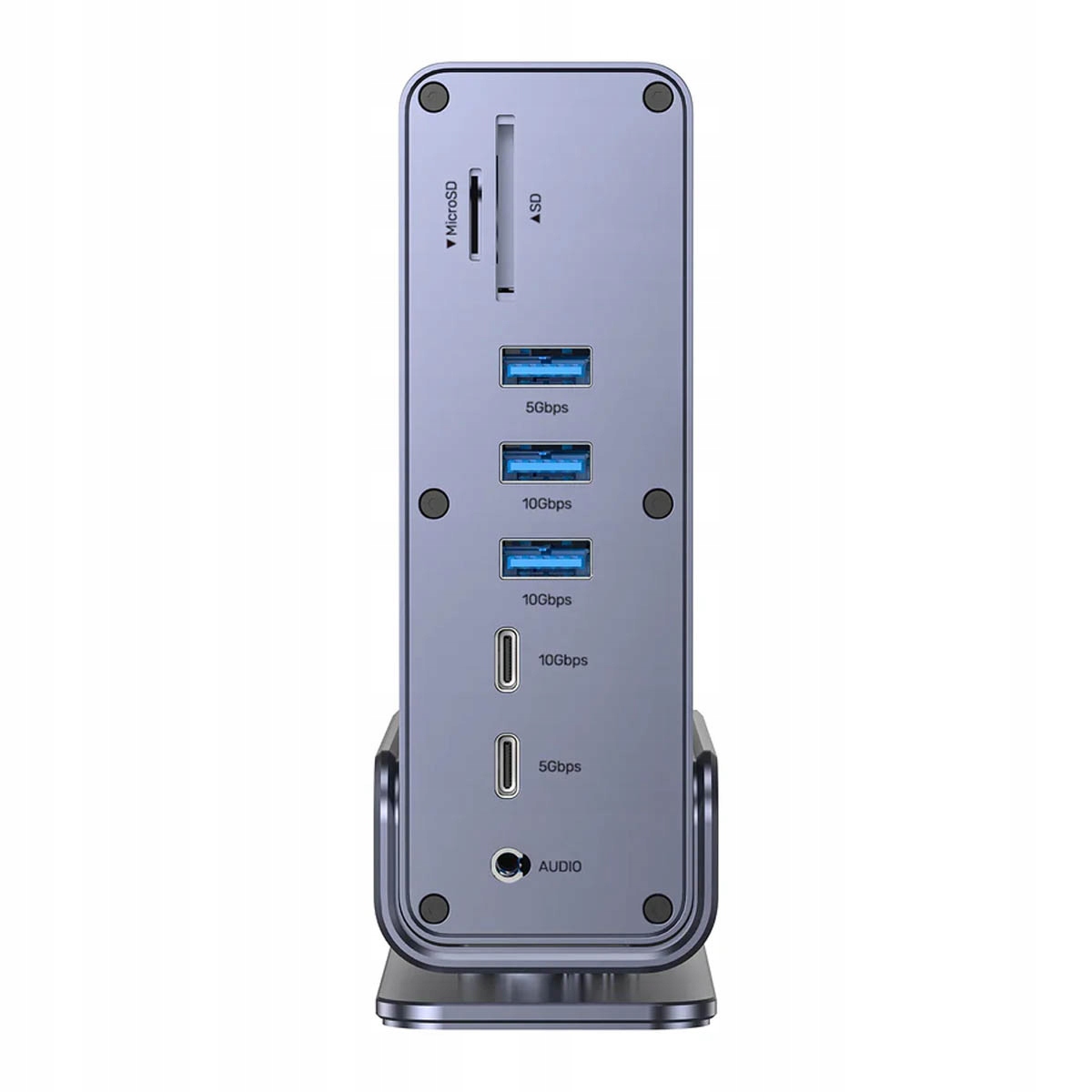 13 portów w jednej obudowie pozwala podłączyć praktycznie wszystko: pamięci zewnętrzne, myszki, słuchawki, karty SD, sieć LAN i więcej. Idealne rozwiązanie do pracy stacjonarnej, hybrydowej i mobilnej.
