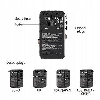 Wbudowane, wysuwane wtyczki obsługujące standardy europejskie (EU), brytyjskie (UK), amerykańskie (US) oraz australijskie/chińskie (AU/CN) pozwalają na bezproblemowe korzystanie z lokalnych gniazdek w niemal każdym zakątku świata. Idealny do ładowania laptopów, smartfonów, tabletów, głośników Bluetooth, powerbanków i innych urządzeń mobilnych.