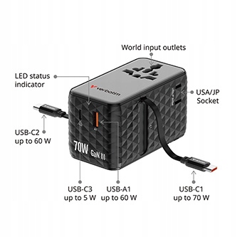 Możliwość jednoczesnego ładowania aż sześciu urządzeń sprawia, że adapter Verbatim Charge n Travel to niezastąpione narzędzie dla podróżujących z wieloma sprzętami elektronicznymi. Złącza obejmują gniazdo AC, jedno gniazdo USA/JP, dwa porty USB-C, port USB-A oraz dwa kable USB-C. Obsługa standardów PD 3.0 oraz QC 4+ umożliwia szybkie ładowanie z mocą do 70 W (dla USB-C) oraz do 60 W (dla USB-A).