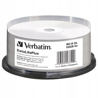 Płyty Verbatim BD-R DL o pojemności 50GB to wysokiej jakości nośniki optyczne przeznaczone do zapisu danych, filmów w wysokiej rozdzielczości oraz archiwizacji dużych plików. Dwuwarstwowa konstrukcja pozwala na zapis aż do 50GB danych na jednej płycie, co odpowiada około 10 godzinom materiału w jakości HD. Dzięki prędkości zapisu do 6x możliwe jest szybkie i efektywne nagrywanie nawet bardzo dużych plików.