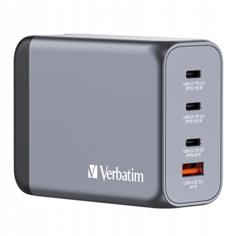Ładowarka ścienna GaN firmy Verbatim o mocy 200 W łączy dwa porty USB-C PD 100 W, jeden port USB-C PD 65 W i jeden port USB-A QC 3.0 w eleganckiej obudowie wielkości dłoni. Idealnie nada się do biura, domu lub na podróż i zasili Twój laptop, tablet, smartfon, urządzenia gamingowe i nie tylko.
