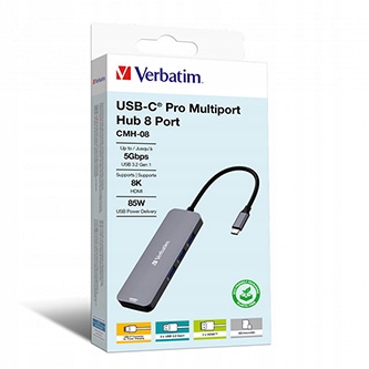 Koncentrator wieloportowy Verbatim CMH-08 USB-C® Pro to doskonałe rozwiązanie dla osób potrzebujących wygodnego sposobu rozbudowy możliwości swojego laptopa za pomocą jednego złącza USB-C. Dzięki temu kompaktowemu hubowi można podłączyć wiele urządzeń jednocześnie, zapewniając sobie większą elastyczność w pracy oraz rozrywce.